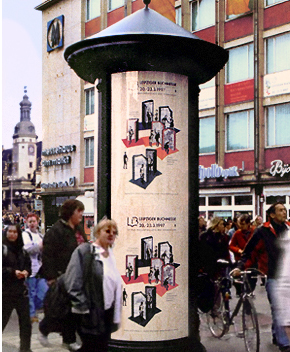 | The Leipzig Book Fair (Leipziger Buchmesse) is the second largest book fair in Germany. As the first large trade meeting of the year it plays an important role in the market and is often where new publications are first presented. The Leipzig Book Fair aims to be for the public, above all, and to emphasize the relationship between between book lovers and sellers. Since 1990s The Leipzig Book Fair has held an annual competition inviting tree creative agencies from Germany to develop the Key Visual for the posters and a visual program. So each year sees a new corporate design; constant element remains the logomark. |